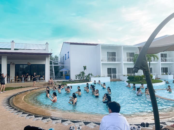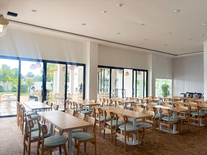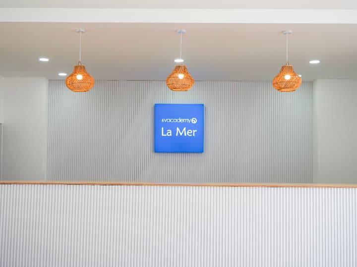 EV Academy La Mer(ラ・メール)校の施設は、キャンパス中央の「大型プール」を中心に、多目的な「Cafe La Mer」、焼きたてパンが自慢の「ダイニング」、そして安全な「キッズプレイエリア」など、親子留学やシニア層の滞在を想定した安心・快適な共用スペースが充実しています。各施設の詳細を以下にご紹介します。