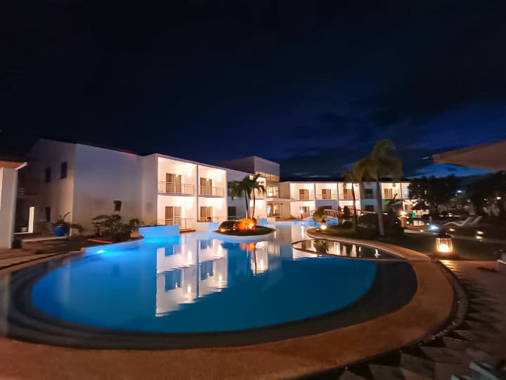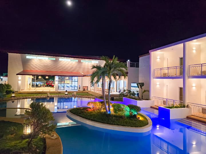 キャンパス中央の大型プールは、夜にはライトアップされ優雅なリフレッシュ空間に。水深の浅いキッズプールも併設されており、小さなお子様連れのご家族も安心してリゾート気分を楽しめます。