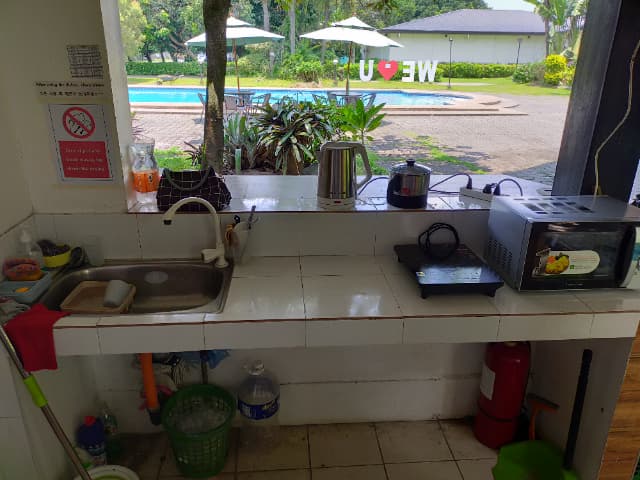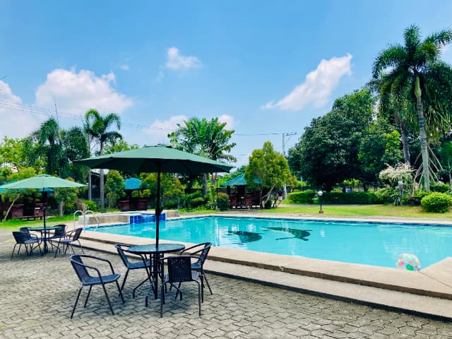 キャンパス中央には、大人用と子ども用のプールが設置されています。周囲にはヤシの木やマンゴーの木など南国の植物が生い茂り、自然の中でリラックスできる雰囲気が広がっています。