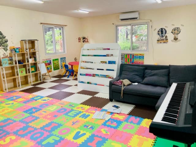 CLARK WE ACADEMY内の幼稚園教室。絵本棚や知育玩具、ピアノなどが揃った学習スペース